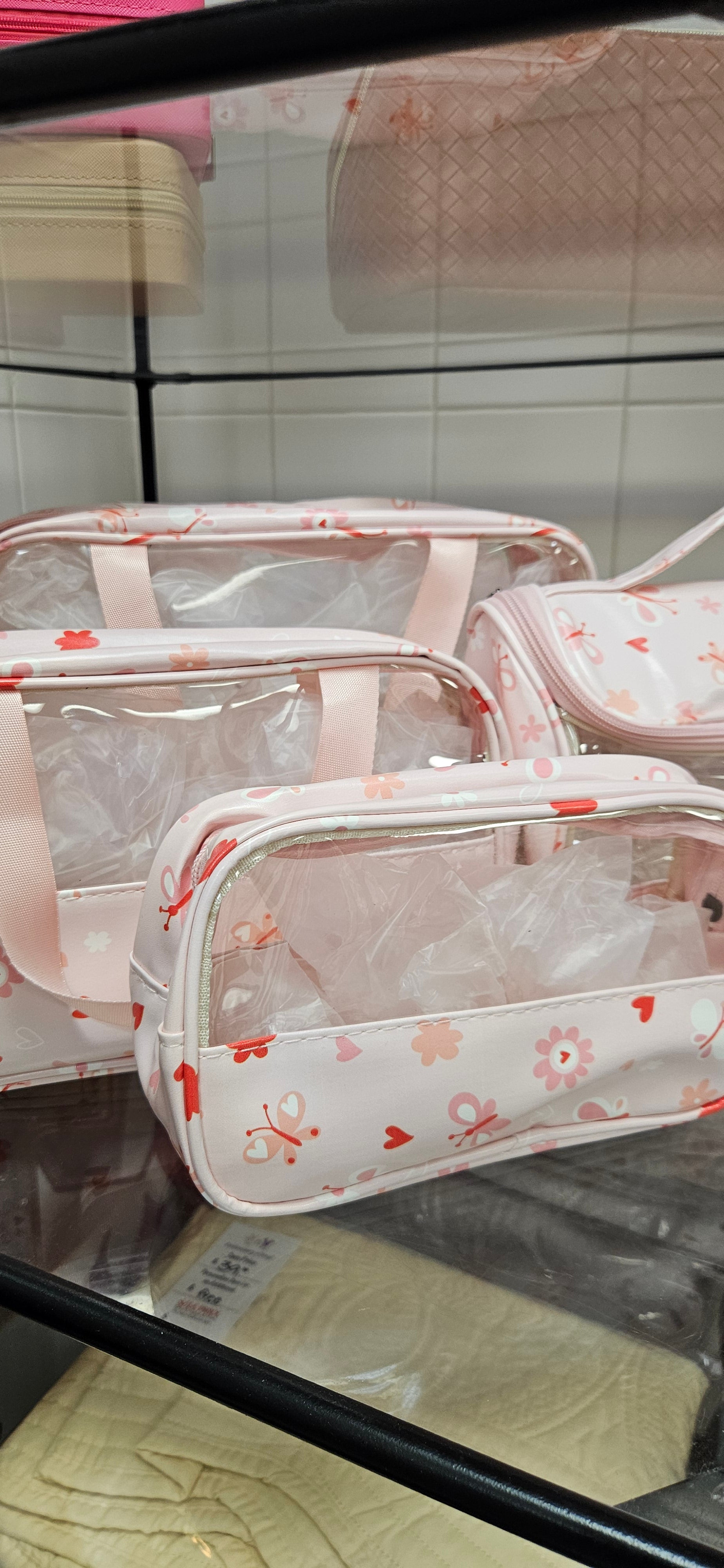 Set Includes a large, medium and small toiletry bag as well as a hanging shower bag